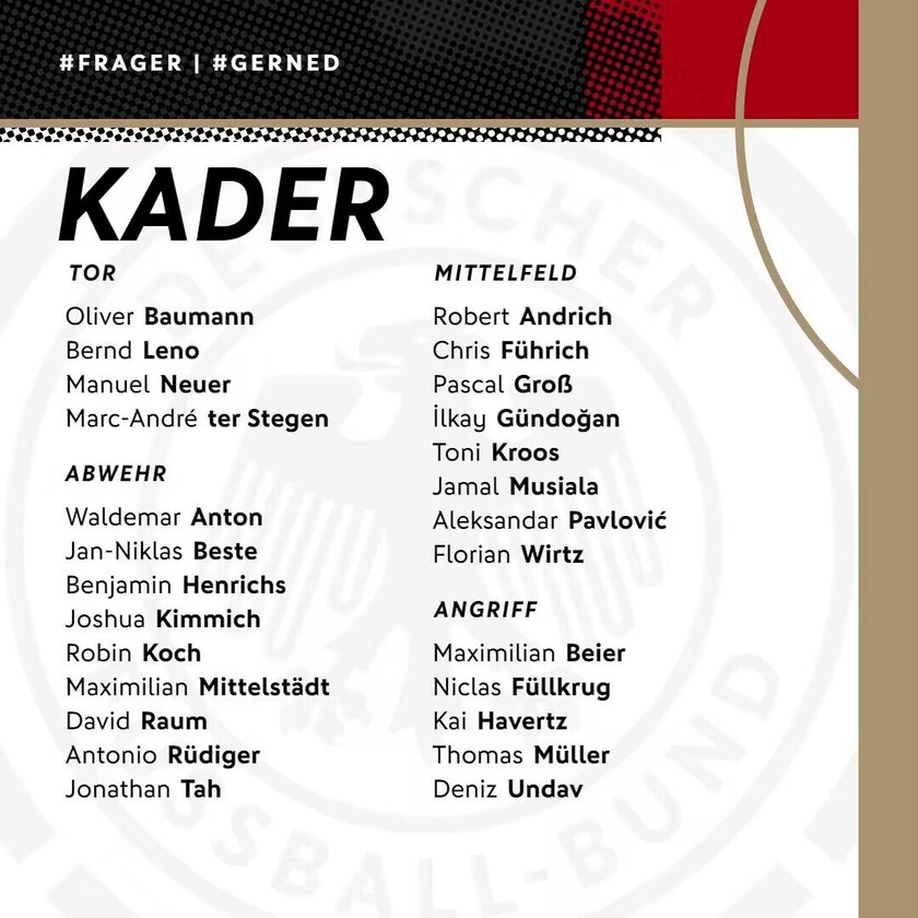 nba直播讯 德国男足公布新一期球员名单,其中34岁的克罗斯正式回归,哈弗茨、基米希在列,小将帕夫洛维奇入选。此次多特蒙德仅菲尔克鲁格1人入选,胡梅尔斯、罗伊斯等未在列。