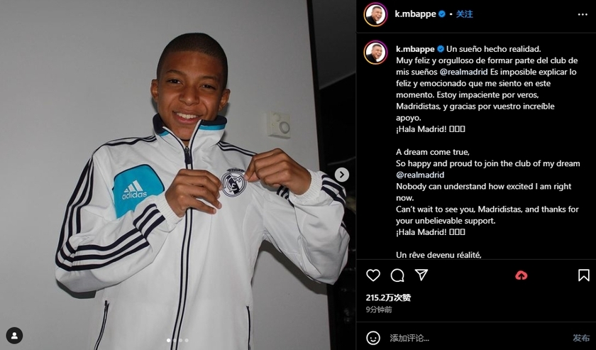 nba直播讯 姆巴佩更新社媒,发文庆祝自己加盟儿时梦想的俱乐部皇马。
