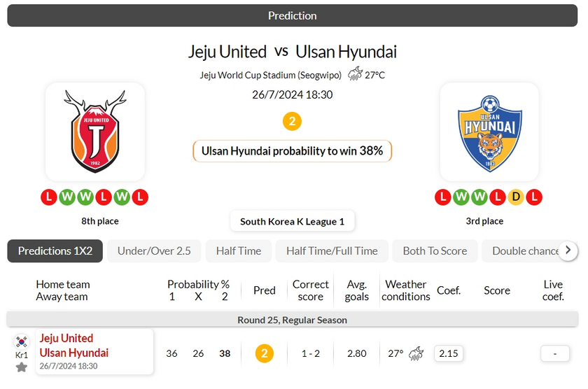 Ulsan Hyundai are undefeated in 15 of their last 16 games against Jeju United in K League 1