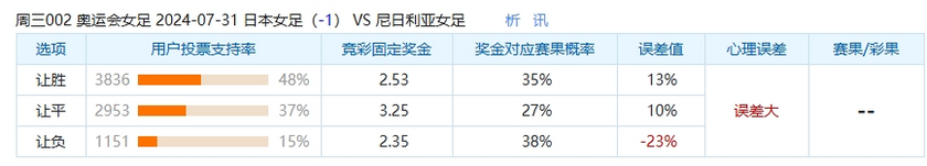 这场比赛中,选择尼日利亚女足不败的球迷偏少了,只有15%的球迷选择了让负选项,大家都看好日本女足能取得比赛的胜利并且有可能是一场大胜,但是这也与奖金对应赛果概率的38%相差了23%,很多球迷都更愿意去看好日本女足,在已经结束的2轮小组赛中,日本女足取得1胜0平1负积3分的战绩。首场小组赛,日本女足1-2遗憾输给西班牙女足。随后第二轮小组赛,日本女足2-1小胜巴西女足。在此期间,日本女足进攻端合计打进3粒进球,场均进球数为1.5个,进攻火力输出不错,日本女足在面对强敌的时候总是能发挥出不错的效果,被看好也是情理之中。不过本场比赛也有值得注意的爆冷的点。