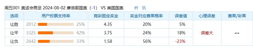 这场比赛中,选择美国国奥不败的球迷偏少了,只有33%的球迷选择了让负选项,大家都看好摩洛哥国奥能取得比赛的胜利并且有可能是一场大胜,但是这也与奖金对应赛果概率的56%相差了23%,很多球迷都看好摩洛哥国奥,毕竟在这届奥运会男足小组赛中,他们首战就击退强大的阿根廷U23,在与乌克兰U23的交锋中虽然战败,但他们在与伊拉克U23的交锋中打出三个净胜球,一举锁定了小组第一。今年的摩洛哥国奥有一股“黑马”的风气,被球迷看好也属于情理之中。再加上全队总身价高达1.65亿欧元,拉希米、穆尼尔·穆罕默迪三名超龄球员,其中名气最大的是在法甲霸主巴黎圣日耳曼效力的阿什拉夫,实力足以拉开美国两个差距。