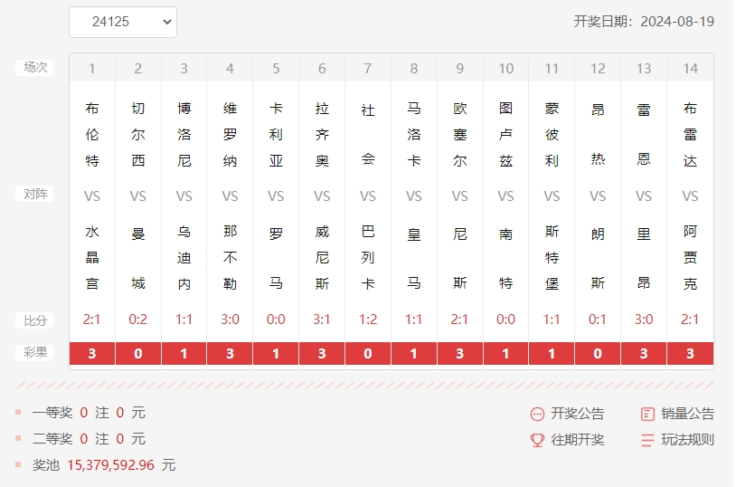 nba直播讯 北京时间8月19日,胜负彩第24125期开奖结果揭晓。本期胜负彩也看到五大联赛造冷的能力异于常人,三场惊天大冷,问苍天如何防范?第一场维罗纳VS那不勒斯,我们想过小胜,想过平局,但怎么也没有想到是维罗纳3-0完胜。皇家马德里也是,前场美如画,后场豆腐渣,此役皇家马德里没有失去三分已经是万幸,亿元锋线沦为笑柄,球迷朋友们更无比希望克罗斯退役又复出,迎来人生第二春,但这终究也是梦想!荷甲方面武器大师廉颇老矣,居然被名不见经传的布雷达2-1羞辱,一代宗师轰然倒下,江湖再无叶问师傅一个打十一个的传说。下一期胜负彩丰厚滚存,各路英豪已经饥渴难耐了!
