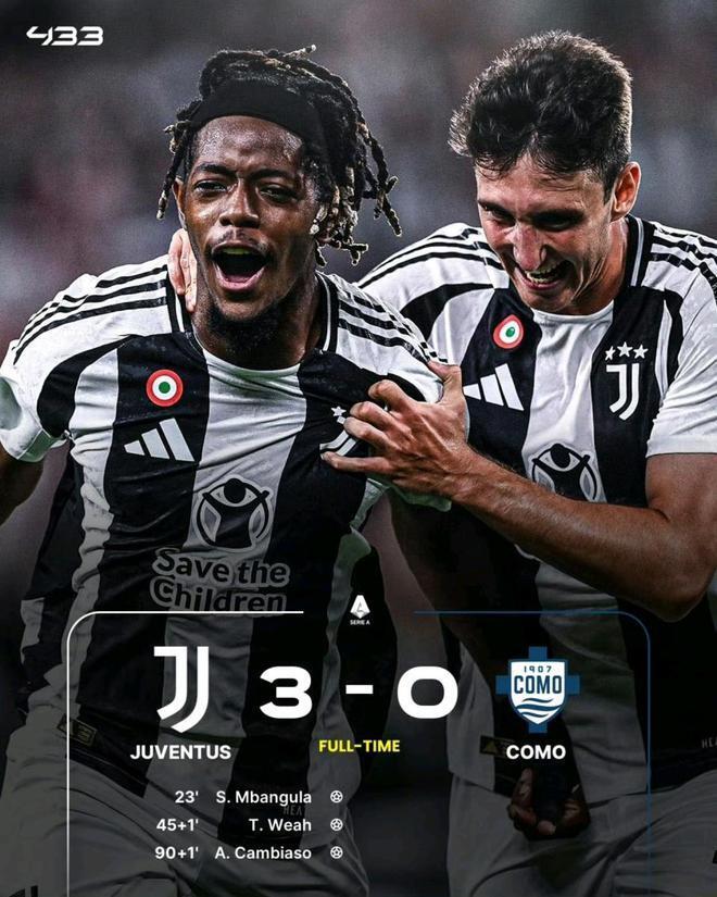 上半场,姆班古拉内切低射破门,弗拉霍维奇低射击中立柱,维阿抽射扩大比分。下半场,弗拉霍维奇进球被吹,随后弗拉霍维奇头球击中立柱,补时阶段,姆班古拉助攻安德烈亚-坎比亚索远射破门,最终,尤文3-0科莫迎联赛开门红。