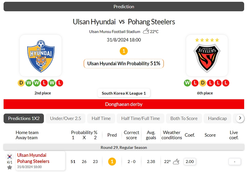 Ulsan Hyundai are unbeaten in 29 of their 33 most recent home matches (K League 1)
