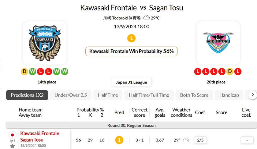 Kawasaki Frontale are on a run of 12 consecutive home undefeated at half time matches against Sagan Tosu in the league