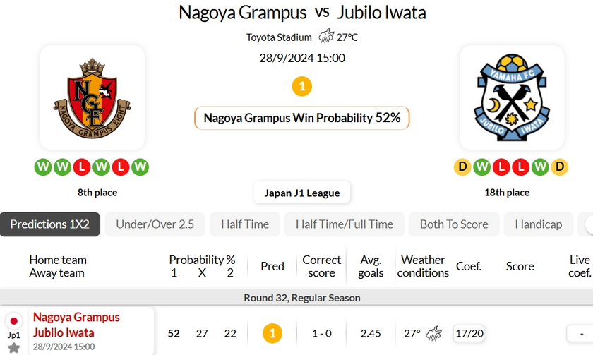 Nagoya Grampus haven't suffered a defeat at HT in their 15 most recent encounters with Jubilo Iwata (J1 League)