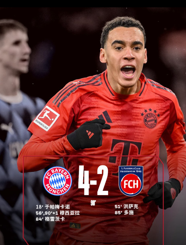 伤停补时阶段,穆西亚拉再次发威。他在中场接到队友的传球后,带球长途奔袭,突入禁区后冷静射门得手,上演了梅开二度的好戏。这一进球也为拜仁慕尼黑锁定了4-2的胜局。