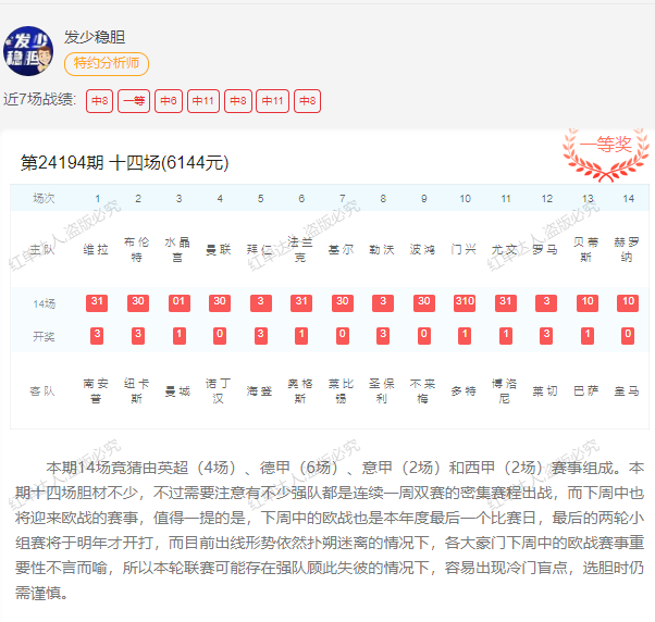 发少稳胆14场胜负彩24195期,发少今日继续奉上本期胜负彩游戏焦点赛事赛果精心预测,希望能够对广大彩民有所帮助,欢迎大家长期关注支持!