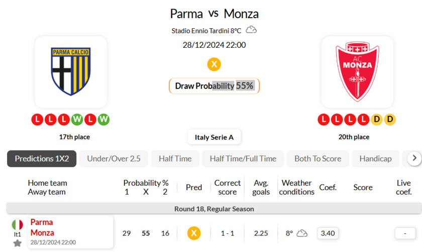 蒙扎在最近的意甲比赛中遭遇了 3 场 HT/FT 失败
