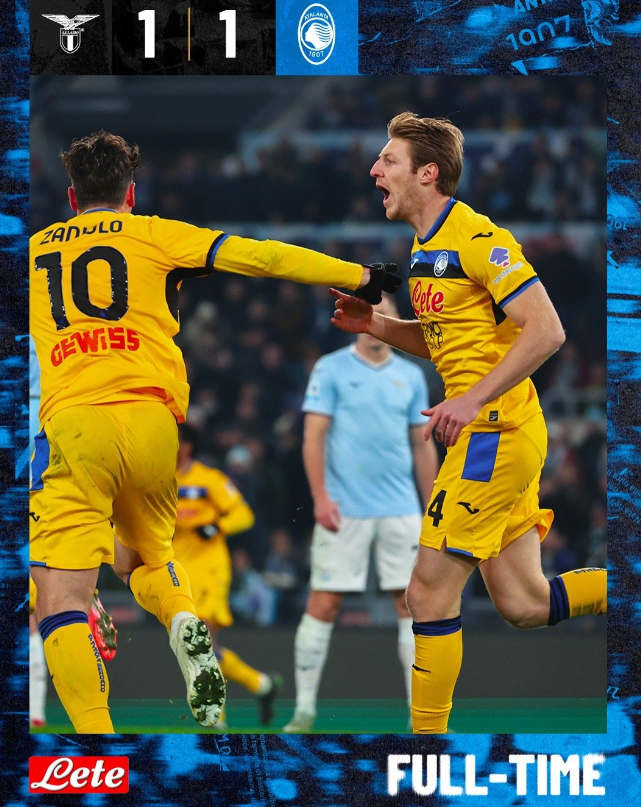 最终,随着裁判的一声哨响,全场比赛结束。拉齐奥与亚特兰大以1-1的比分握手言和。