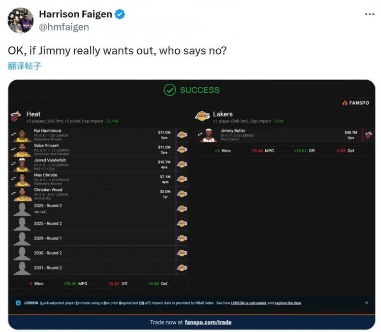 还有湖人队记者Faigen给出的交易方案,打包送出八村塁、文森特、范德比尔特、克里斯蒂、伍德、一个首轮签和4个次轮签,从热火挖来巴特勒。