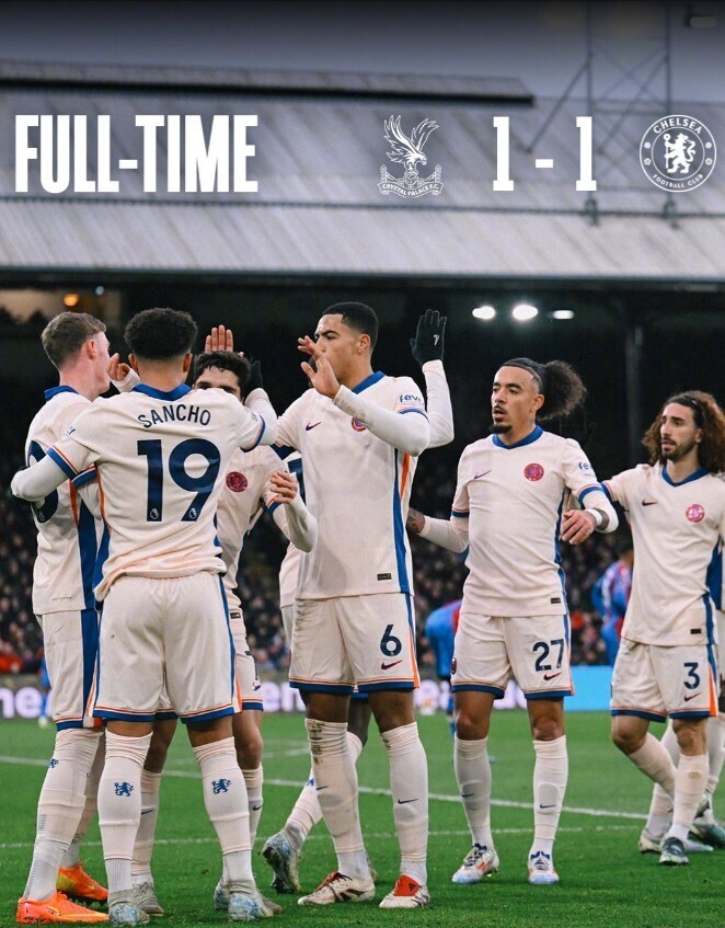 这场比赛在塞尔赫斯特公园球场开打。上半场,桑乔助攻,帕尔默接应,成功得分,杰克逊失错失得分机会。下半场,桑切斯救主成功,杰克逊单刀,可惜不进,内托禁区倒地,但是裁判没有吹罚,马特塔顺利得分,追成和局。完场,切尔西1-1水晶宫。切尔西已经4轮不胜,拿到36个积分,处于英超第四,水晶宫拿到21分,排名英超第十五。