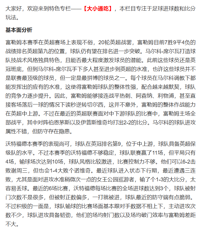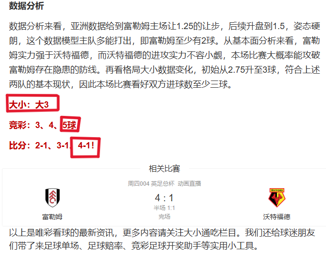 nba直播讯 昨日足总杯第三轮战罢,富勒姆主场最终4-1击败了沃特福德,球队成功突围到足总杯第三轮的比赛。【本场比赛大小通吃的大3,进球数5,竞足比分4-1成功命中!!!】