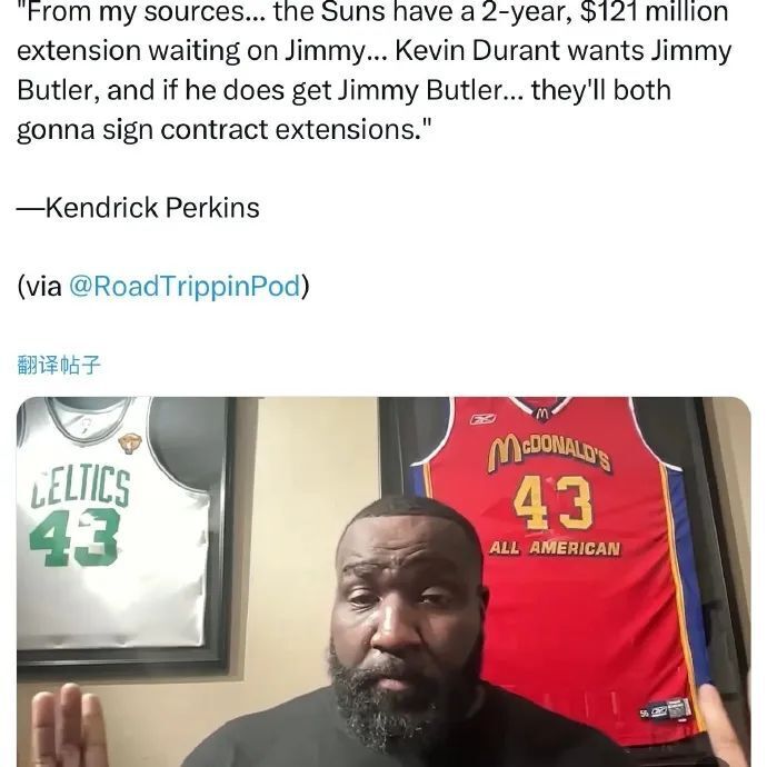 键盘侠MVP&前NBA球员帕金斯不知道从谁家床底下偷听到的消息,表示太阳已为巴特勒准备好了两年1.21亿美元续约合同。