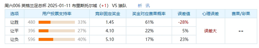 本场比赛中,选择布里斯托城获让球胜的球迷偏少了,只有33%的球迷选择获让球胜选项,这场比赛中,大家都看好客场的狼队会赢得这场比赛,不看好布里斯托城能在主场保住不败,但是这也与奖金对应赛果概率的61%相差28%。
