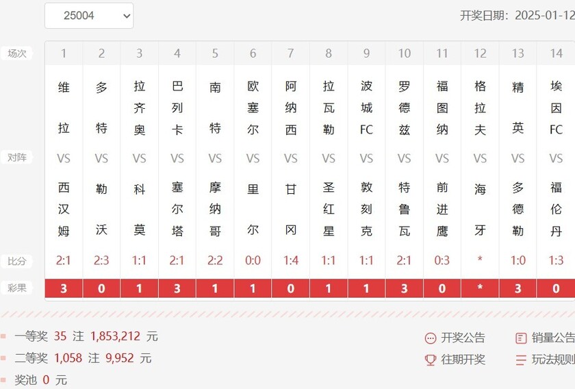 nba直播讯 北京时间1月12日,胜负彩第25004期开奖。本期足彩荷乙联赛格拉夫夏普vs海牙因天气原因被迫延期,本场比赛未能在1月12日前补赛,彩果将按310全对计算。