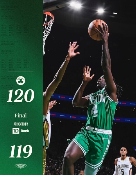 凯尔特人在与鹈鹕的比赛中,半场结束时以62-61微弱领先。比赛最后时刻,塔图姆两罚不中,怀特发球五秒违例,送给鹈鹕绝杀机会。但麦科勒姆未能把握住机会,绝杀上篮不中。最终,凯尔特人以120-119险胜鹈鹕。