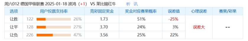 本场比赛中,选择波鸿让胜的球迷偏少了,只有26%的球迷选择让球负选项,这场比赛中,大家都看好客队的莱比锡红牛赢得这场比赛,不看好波鸿在主场保住不败,但是这也与奖金对应赛果概率的51%相差25%。