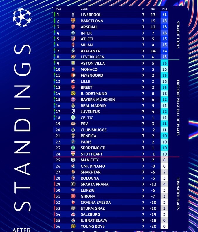 nba直播讯 北京时间1月23日,欧冠小组赛第七轮全部比赛尘埃落定,最新积分榜排名揭晓!