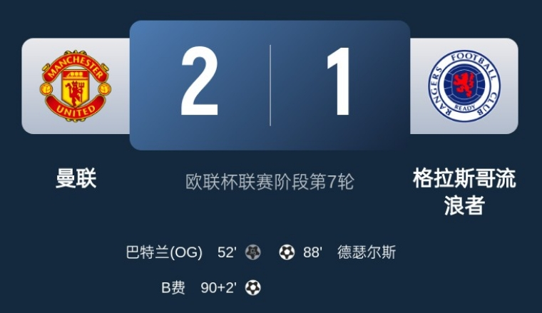 上半场,德里赫特头球建功,可惜被判无效。下半场,巴特兰造出乌龙,非常诡异;加纳乔失也错失良机;马奎尔冒顶,德瑟尔斯抓住机会。为球队绝平;补时阶段B费把握绝杀机会!完场,曼联2-1流浪者,欧联杯7轮,曼联4胜3平保持不败,积分榜上排名第4名。
