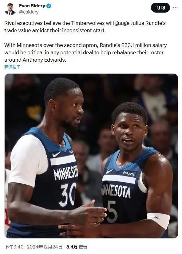 对于本赛季糟糕的局面,森林狼正想着亡羊补牢,办法是计划在今年交易截止日前送走“平替”唐斯的兰德尔,后者本赛季至今场均得到18.9分7.3板4.5助,投篮命中率46.8%,场均以33.2%命中率扔进1.5记三分球。