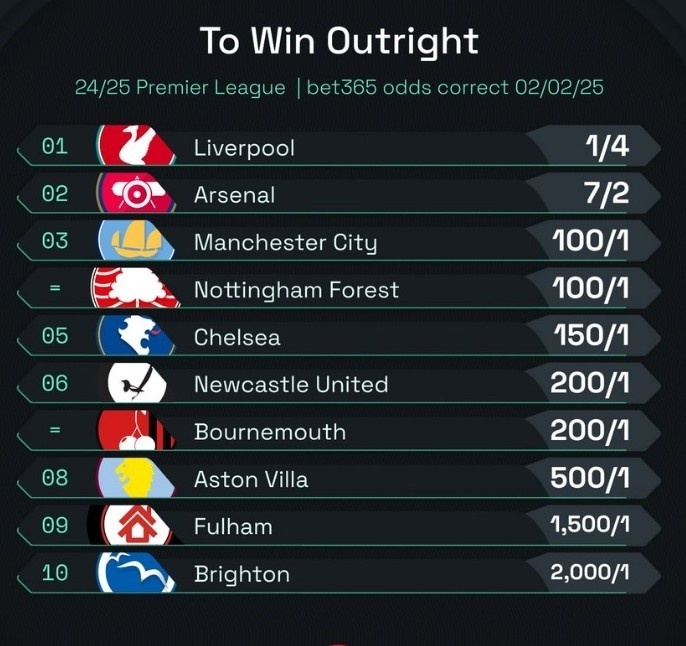 nba直播讯 在本轮英超焦点战中,阿森纳主场5-1大胜曼城,这场胜利不仅让枪手在积分榜上紧追利物浦,也彻底改变了本赛季英超的争冠格局。最新夺冠赔率显示,利物浦和阿森纳已经成为夺冠的最大热门,而曼城的赔率则大幅下滑,与诺丁汉森林并列第三。