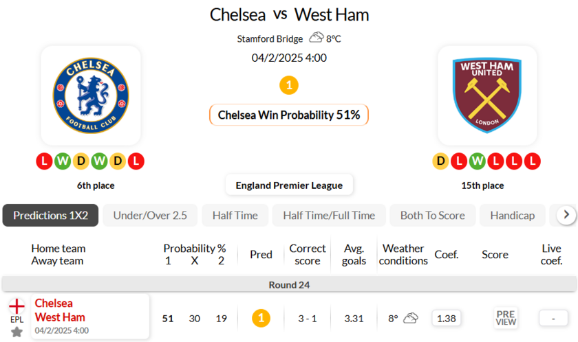 Chelsea have won all of their last 4 home matchesagainst West Ham in Premier League
