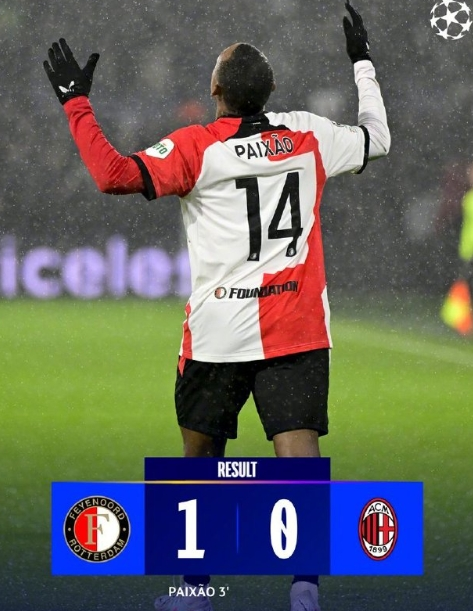 因为在联赛阶段最后一轮意外爆冷输球,米兰前八的排名掉到了附加赛区域;对阵荷甲豪门费耶诺德,米兰全场进攻端低迷。莱奥,菲利克斯以及面对旧主的希门尼斯都未能制造什么像样的威胁;反倒是开场第3分钟,派尚外围远射造成迈尼昂扑球失误,从而完成了全场唯一一次得分。客场输球后的米兰已经欧冠2连败,稍显安慰的是,一球的差距以及次回合主场作战还是具备翻盘的希望。