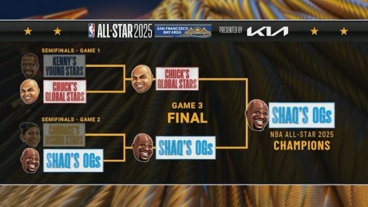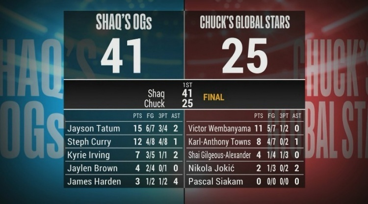 暂停期间,赛场举行了全明星交接仪式,并对 TNT 解说天团致以崇高敬意。仪式结束后,文班亚马也命中了他在本场比赛的首记三分。但欧文与杰伦-布朗紧密配合,帮助奥尼尔队始终保持着10分左右的领先优势。比赛接近尾声,库里火力全开,连续命中三分,为奥尼尔队拿到赛点。最后,塔图姆以一记空切扣空篮锁定胜局。最终,奥尼尔队以41-25的比分战胜巴克利队,成功捧起冠军奖杯。