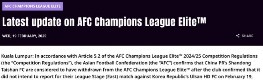 如果根据《亚足联冠军联赛精英赛2024/25竞赛规程》(简称"竞赛规程")第5.2条款规定,亚足联确认中国山东泰山足球俱乐部因明确表示不参加原定于2025年2月19日与韩国蔚山HD足球俱乐部进行的东亚区联赛阶段赛事,现被视为退出本届亚足联冠军联赛精英赛。