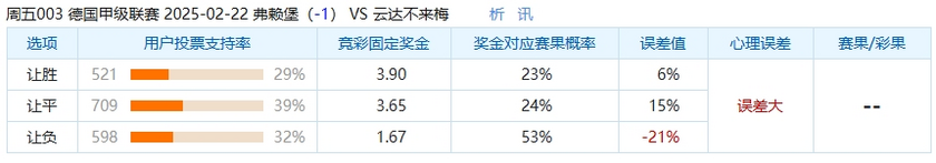 本场比赛中,选弗莱堡让球负的球迷偏少了,只有32%的球迷选择获让球胜选项,这场比赛中,大家都看好弗莱堡主场会赢得这场比赛,不看好不莱梅能客场保住不败,但是奖金对应赛果概率的53%相差21%,数据误差较大。