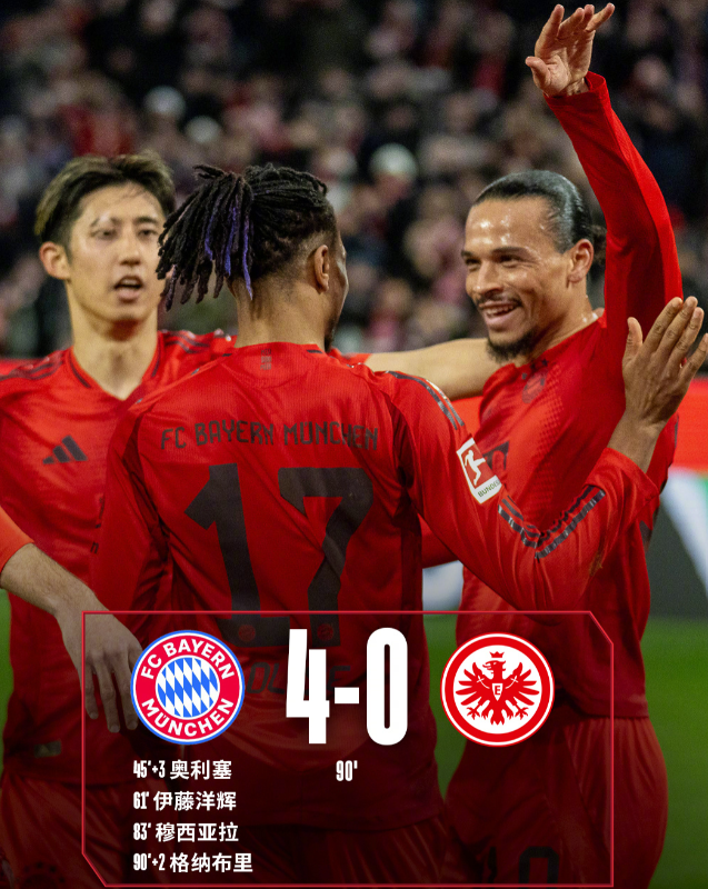 德甲联赛第23轮,拜仁主场迎战法兰克福,上半场尾声阶段,萨内突破送出助攻,奥利塞轻松破门打破僵局。下半场,伊藤洋辉角球破门扩大比分,格纳布里打门穿裆入网,穆西亚拉半场奔袭一条龙破门锁定胜局。最终,拜仁4-0大胜法兰克福,继续领跑德甲积分榜,展现了强大的统治力。