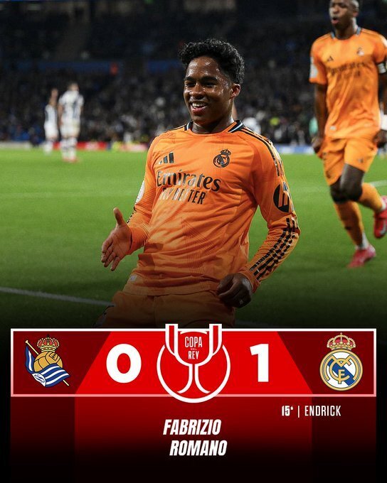 国王杯半决赛首回合皇马挑战皇家社会的比赛在阿诺塔球场进行,上半场贝林厄姆助攻恩德里克单刀破门,卢宁献神扑,下半场恩德里克抽射中楣,雷米罗献精彩扑救,塞巴略斯补时伤退,最终首回合皇马1-0皇家社会占得先机。