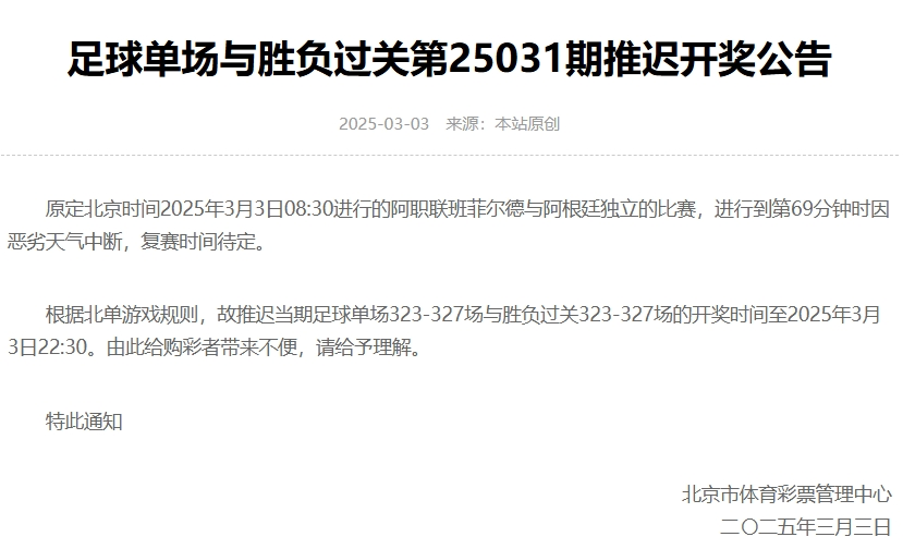 nba直播讯 北京时间3月3日,北京体彩官网发布公告,因阿职联班菲尔德与阿根廷独立的比赛中断,复赛时间待定,当期足球单场323-327场与胜负过关323-327场的开奖时间延期至2025年3月3日22:30。