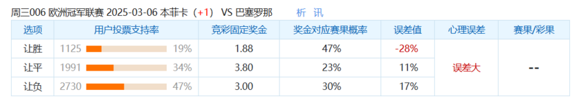 本场比赛中,选本菲卡让球胜的球迷偏少了,只有19%的球迷选择让球胜选项,这场比赛中,大家都看好巴萨客场会赢得这场比赛并且可能大胜这次比赛,不看好本菲卡主场能够保住数据,但是与奖金对应赛果概率的47%相差28%,数据误差较大。