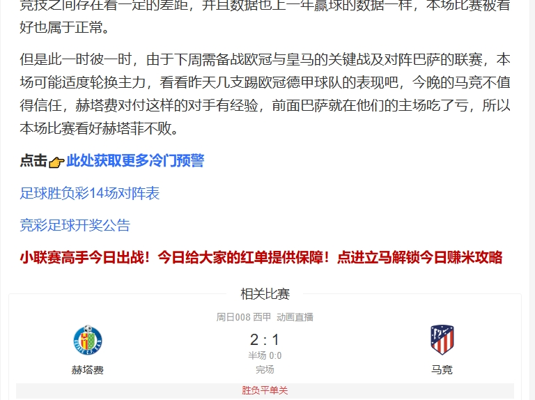 而对于马竞来说, 这场失利让他们无缘连胜,球队仍需为西甲冠军而战。本场比赛冷门预警成功预测出冷门!