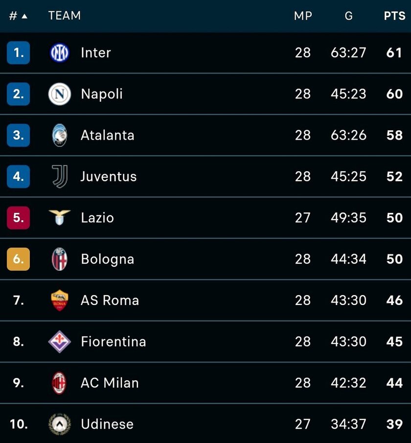 - 榜首之争:国际米兰在本轮逆转战胜蒙扎后,继续稳居积分榜榜首,领先优势扩大到了4分。那不勒斯紧随其后,与国际米兰的差距缩小至4分,依然保持着对榜首的冲击力。