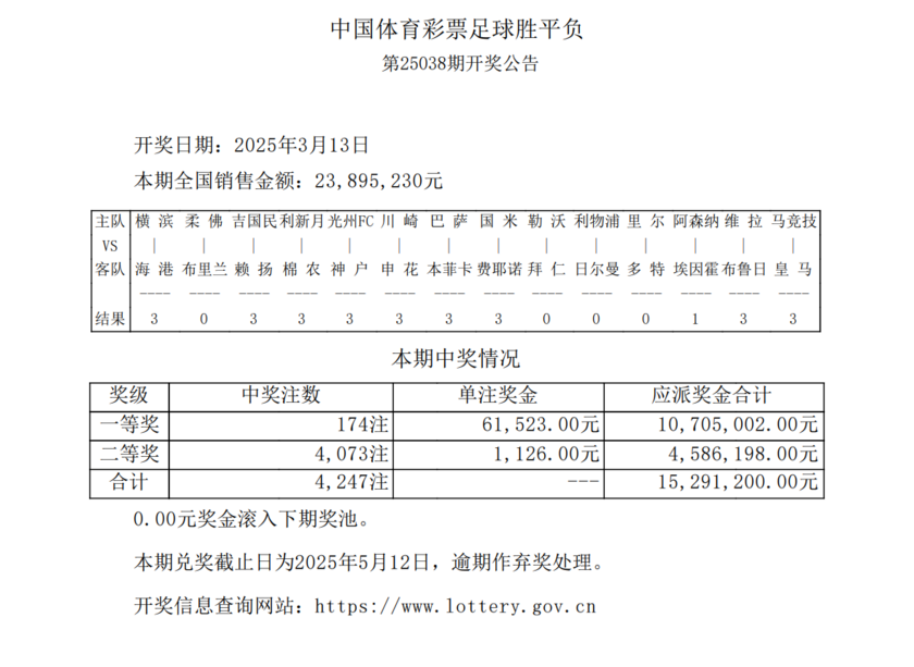 本期足彩的头奖共开出174注,每注奖金为61,523元;二等奖开出4073注,每注奖金1126元;任九玩法共开出21,243注,每注奖金542元。本期足彩的总销售额为23,895,230元,任九投注总额为18,000,744元。