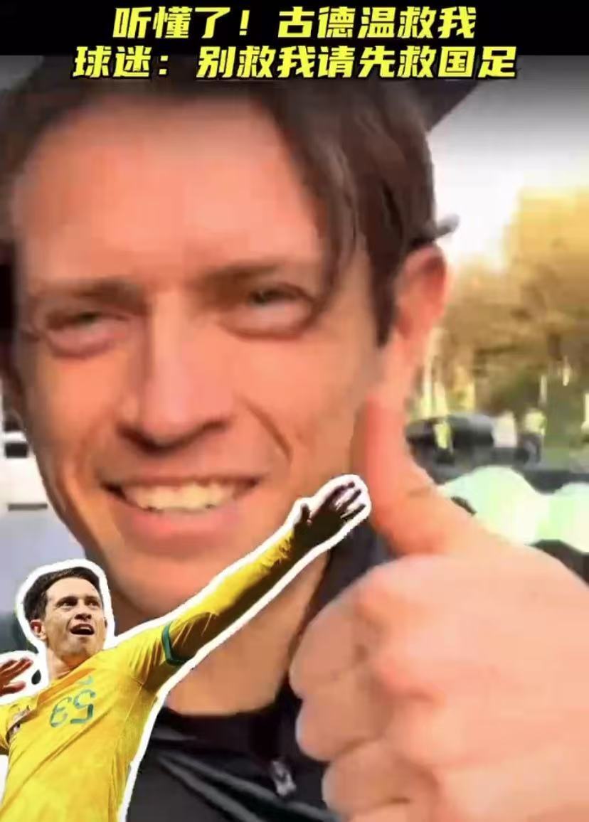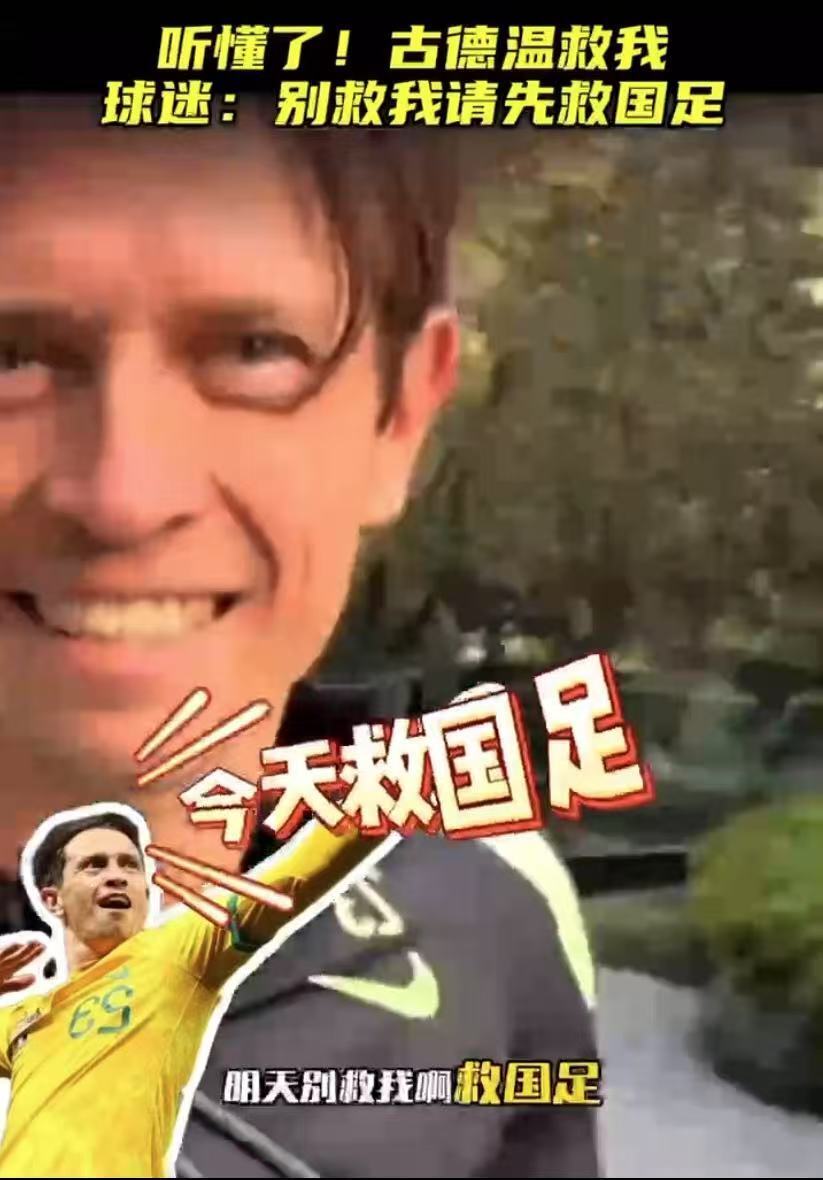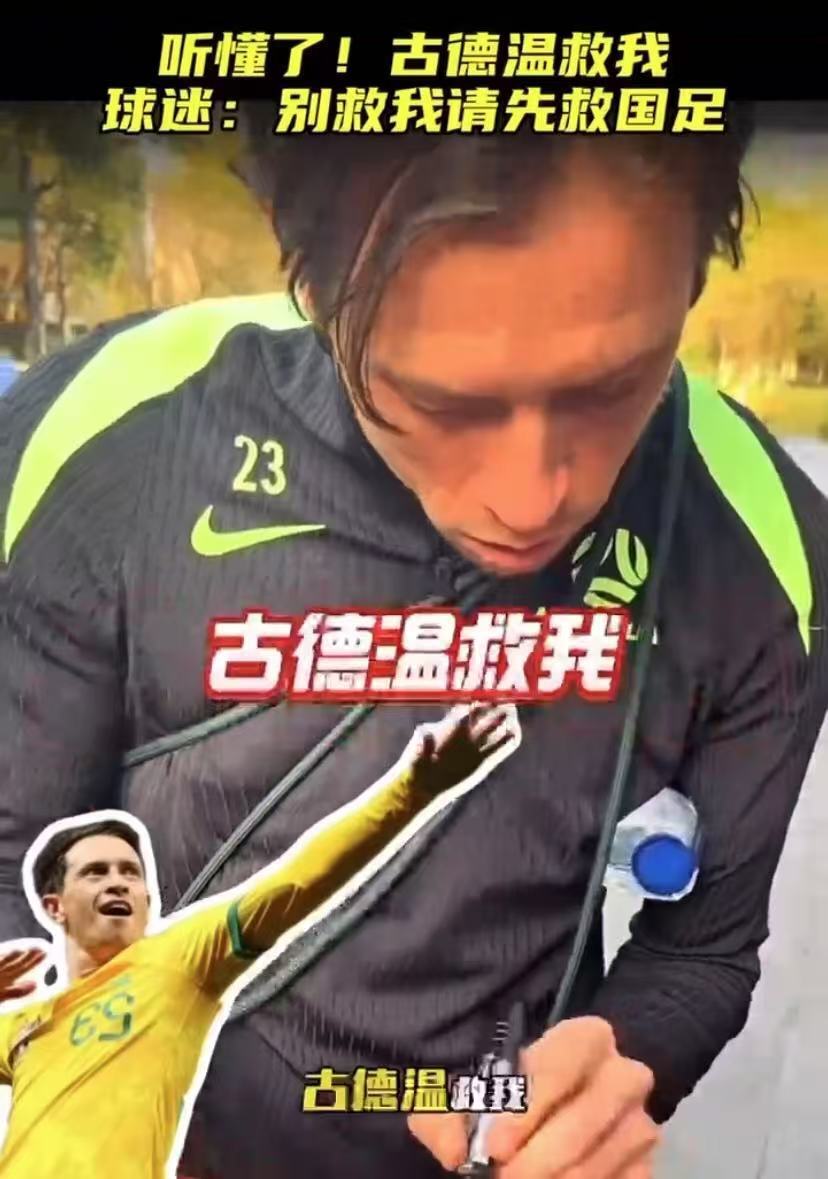 在要签名的过程中,这位球迷喊出名梗“古德温救我”,而古德温似乎听懂了这句中文,露出了灿烂的笑容。该球迷随即向古德温表达了自己的心愿:“明天别救我,救国足!”