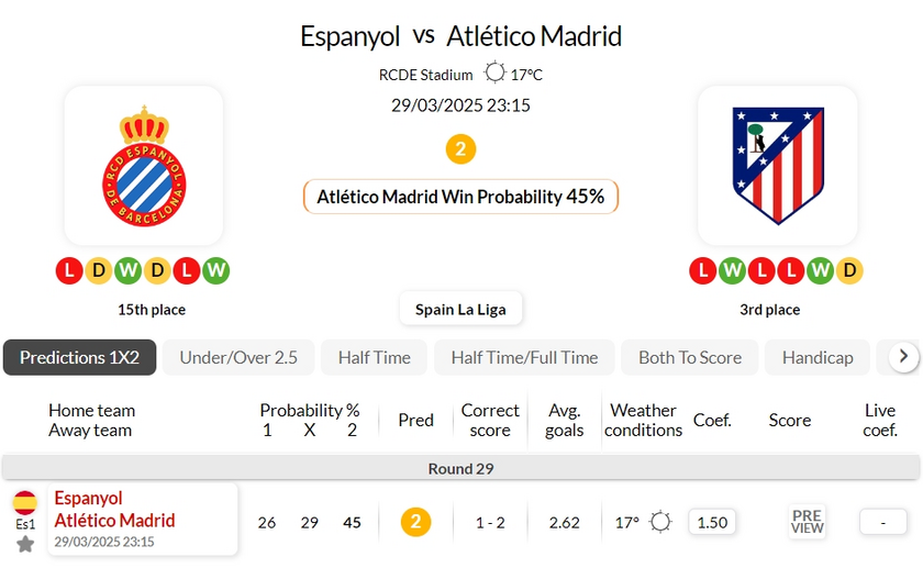 "Espanyol have registered two wins, two draws, and two losses in their last six home fixtures against Atlético Madrid."