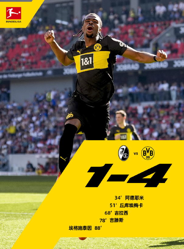 德甲第28轮,弗赖堡在欧罗巴公园球场迎战多特蒙德。第12分钟阿德耶米单刀破门首开纪录,第45分钟丘库埃梅卡远射扩大比分。下半场吉拉西、吉滕斯接连建功,埃格施泰因第81分钟远射破门挽回颜面,多特4-1大胜对手。
