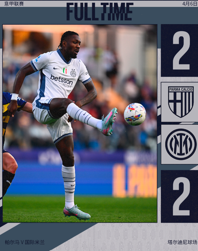 意甲第31轮,帕尔马在塔尔迪尼球场迎战国际米兰。上半场第30分钟,邓弗里斯右路突破后精准传中,达米安后点包抄头球破门首开纪录。第60分钟,劳塔罗中场送出精妙直塞,图拉姆单刀推射远角得手,将比分扩大为2-0。易边再战,第72分钟贝尔纳韦接队友倒三角回传推射破门,为主队扳回一城。第85分钟翁德赖伊卡门前混战中捅射建功,帮助帕尔马2-2顽强扳平。最终蓝黑军团客场痛失好局,与升班马握手言和。