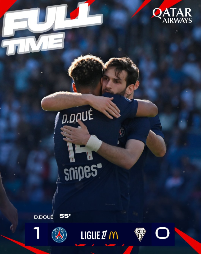 法甲第28轮,巴黎圣日耳曼在王子公园对阵昂热。第65分钟克瓦拉茨赫利亚左路突破传中,替补登场的杜埃后点垫射打入制胜球。凭借这粒进球,大巴黎1-0小胜,提前6轮加冕联赛冠军。