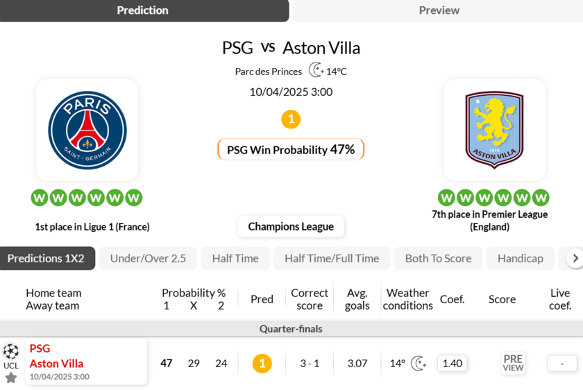 - Aston Villa are unbeaten in 5 of their 6 most recent matches (Champions League).