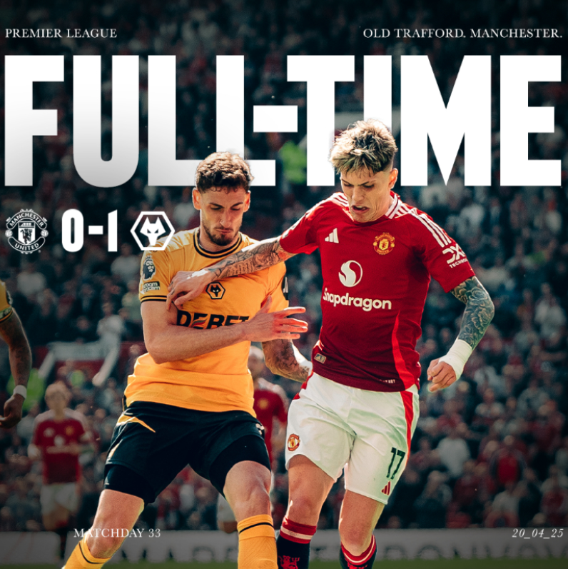 英超联赛第 33 轮,曼联主场与狼队交锋。上半场埃里克森任意球射门被扑,梅努兜射颇具威胁。下半场加纳乔多次传出有威胁的球,霍伊伦、B 费错失良机,萨拉维亚任意球直接破门。最终曼联主场 0-1 负于狼队,本赛季联赛遭狼队双杀。