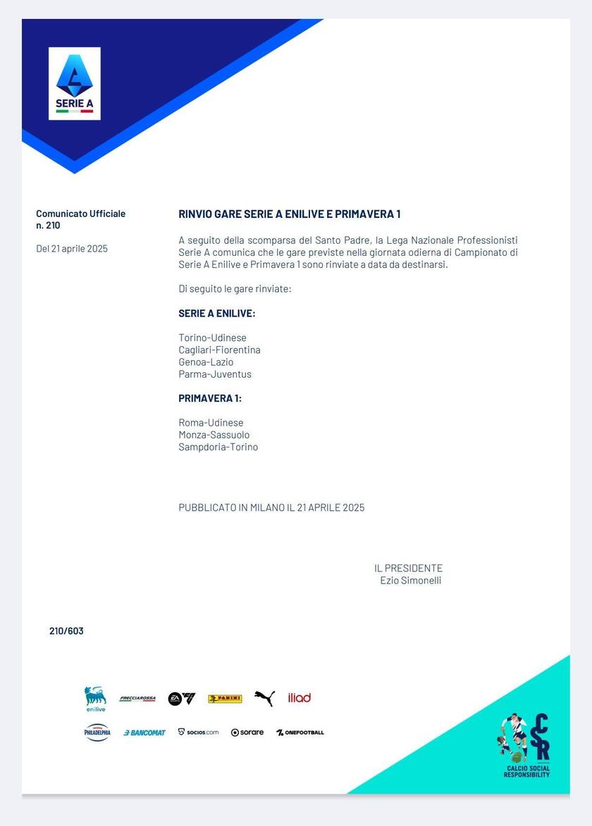 nba直播讯 意大利当地时间4月21日中午,意甲联盟紧急发布公告:受罗马教皇方济各逝世影响,原定于当日进行的4场意甲联赛全部推迟,包括: