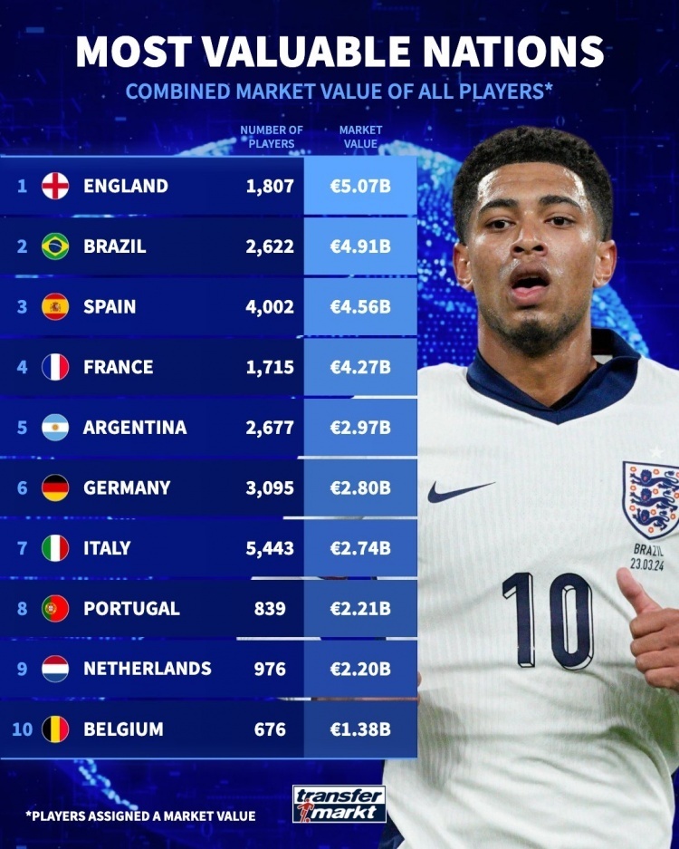 nba直播讯 北京时间4月23日,德国转会市场统计了各国球员的总身价,并列出榜单,英格兰59.7亿欧居首,巴西、西班牙二三位,阿根廷29.7亿位居第5。