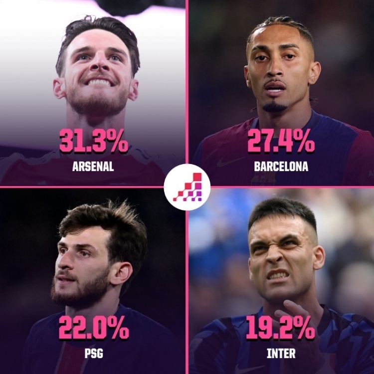 nba直播讯 北京时间4月28日,Opta超级计算机预测了欧冠四强球队夺冠的概率,阿森纳31.3%居首,巴萨27.4%次席,巴黎22%,国米19.2%最低。