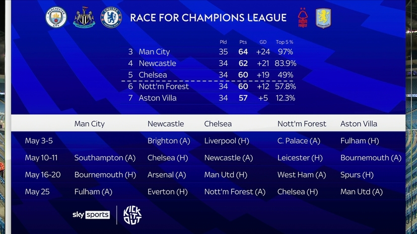 nba直播讯 北京时间5月3日,今天凌晨曼城1-0击败狼队,天空体育晒出Opta的超级计算机预测前五概率,蓝月争五成功的概率已经达到了97%。