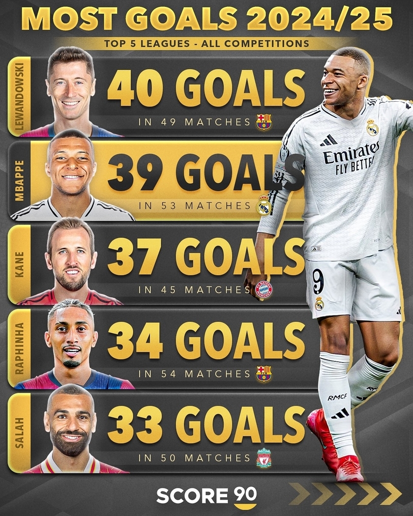 nba直播讯 北京时间5月13日,媒体统计了五大联赛球员本赛季的进球数量,并列出五大联赛射手榜,莱万40球位居榜首,姆巴佩39球紧跟次席。